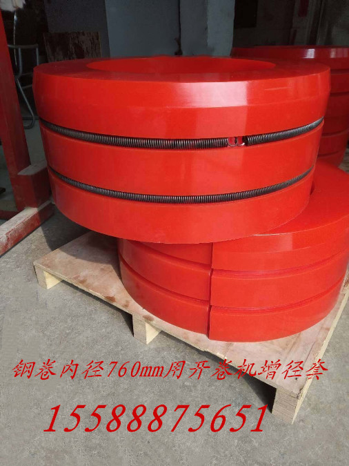 佛山縱剪開平機廠家配套聚氨酯漲芯膠套是一種適用于鋼卷內徑610mm、730mm、760mm用的開卷機增徑膠套,寬度可根據客戶需要定制,產品規格齊全!所采用的聚氨酯材質,使增徑套具有較高的機械強度和氧化穩定性,耐磨性佳,回彈性好!
